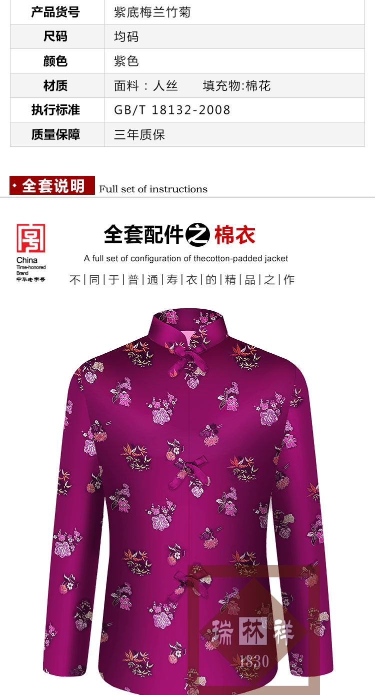 妈妈穿衣服很讲究的,我转遍了西安的很多寿衣店,这寿衣质量大同小异,都很差,我在网上找到这家叫瑞林祥的寿衣,北京的,还是一家百年老字号,我选好花色后,又提供了身高、体重、腰围等数据,付款发货,寿衣收到后,真是不错,家人满意。
